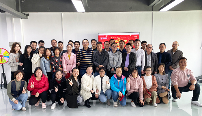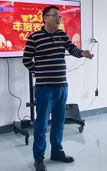 联合智能总经理讲话,在会议中姜总表示感谢各位同仁在2019年辛勤劳动,对公司尽心尽力,希望在2020年各位同仁能够再创佳绩。同事在会议上提出“面对挑战 躬身入局”概念。