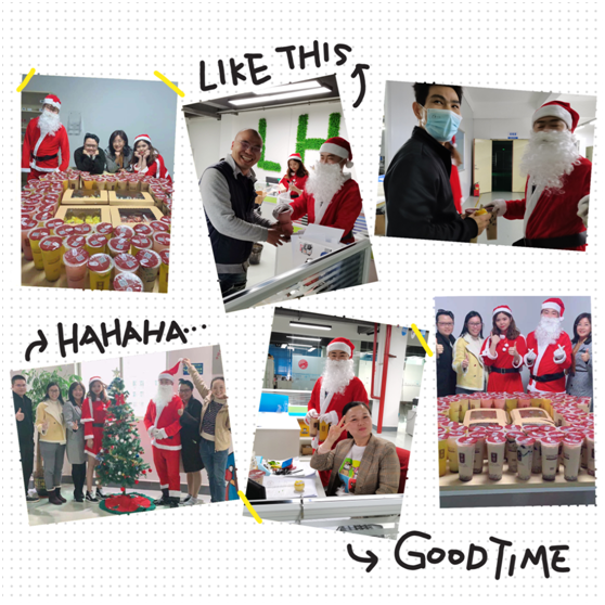 15点30分,活动正式开始,色彩斑斓的圣诞树摇曳四季的祝福,美妙的音乐?铃儿响叮当?环绕在厂区和办公室上空,圣诞老人和圣诞妹妹带着暖暖的甜美,祝福大家圣诞快乐,健康平安!